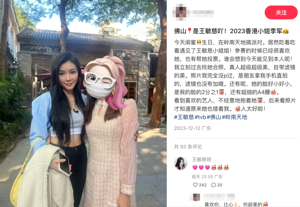 而女網友其實亦是王敏慈的粉絲,她在照片下配文裏就提到自己在王敏慈參賽時已經很喜歡她,也有幫她投票,這次沒想到能遇見對方真人。同時更毫不吝嗇的大讚王敏慈:「真人超級超級美,自帶濾鏡的美。照片我完全沒p過,是朋友拿我手機直拍的,濾鏡也沒有加哦。還有呢,她的臉好小好小,是我的臉的2分之1,還有超細的A4腰。看到喜歡的藝人,不經意地抱着她,後來看照片才知道原來她也摟着我。人太好啦!」