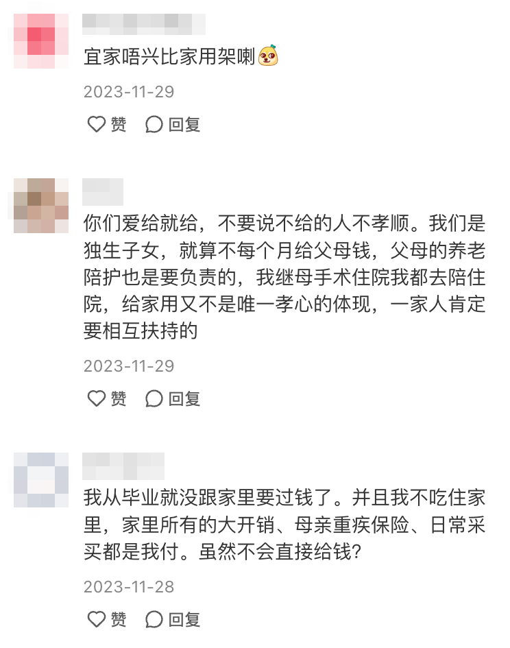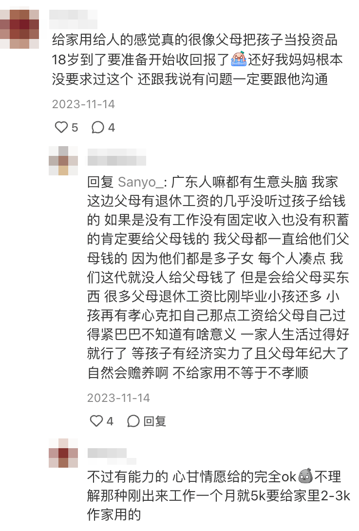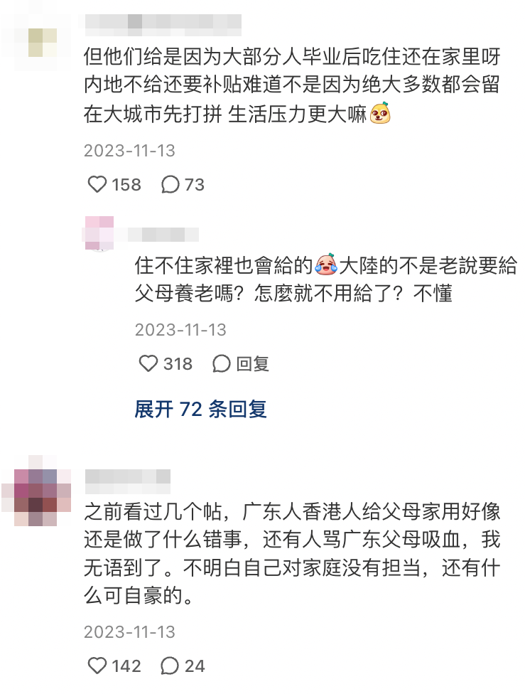 而帖文一出就引起不少網友討論,只因內地疑似沒有畀家用文化,不少人都質疑家用文化指:「宜家唔興比家用㗎喇」、「我一直以為是住在家裡/頻繁回家蹭飯才要給家用。大陸雖然給父母養老,但都是父母錢不夠才會給吧」、「有點震驚,爹媽工資比我高,我才是經濟更困難的那個」、「每個月給家用不代表你愛父母,不給也不代表不愛」、「父母子女之間這樣每個月給錢,好生分的感覺」。更有網友認為這樣的文化像是父母把孩子當投資品:「给家用給人的感覺真的很像父母把孩子當投資品,18歲到了要準備開始收回報了」,甚至指畀家用做法是封建落後的思想觀念。