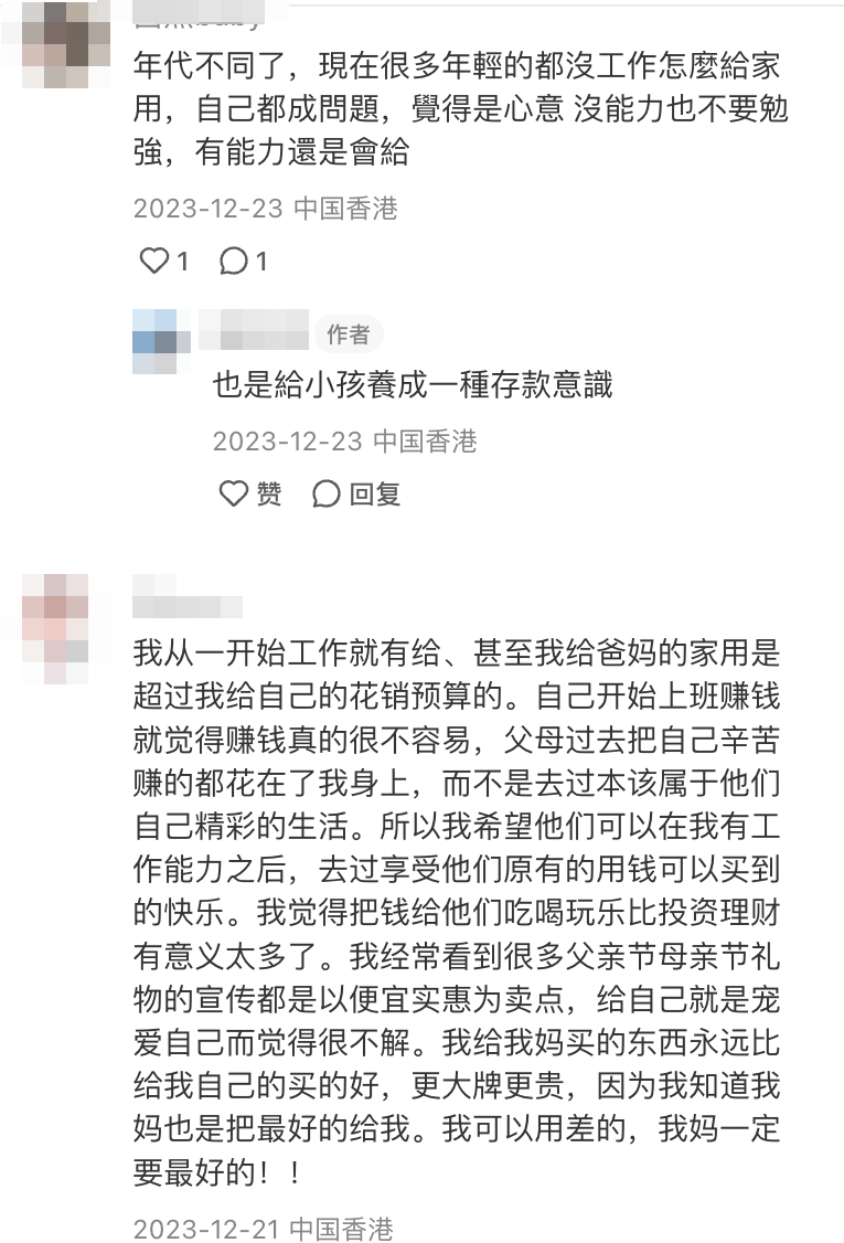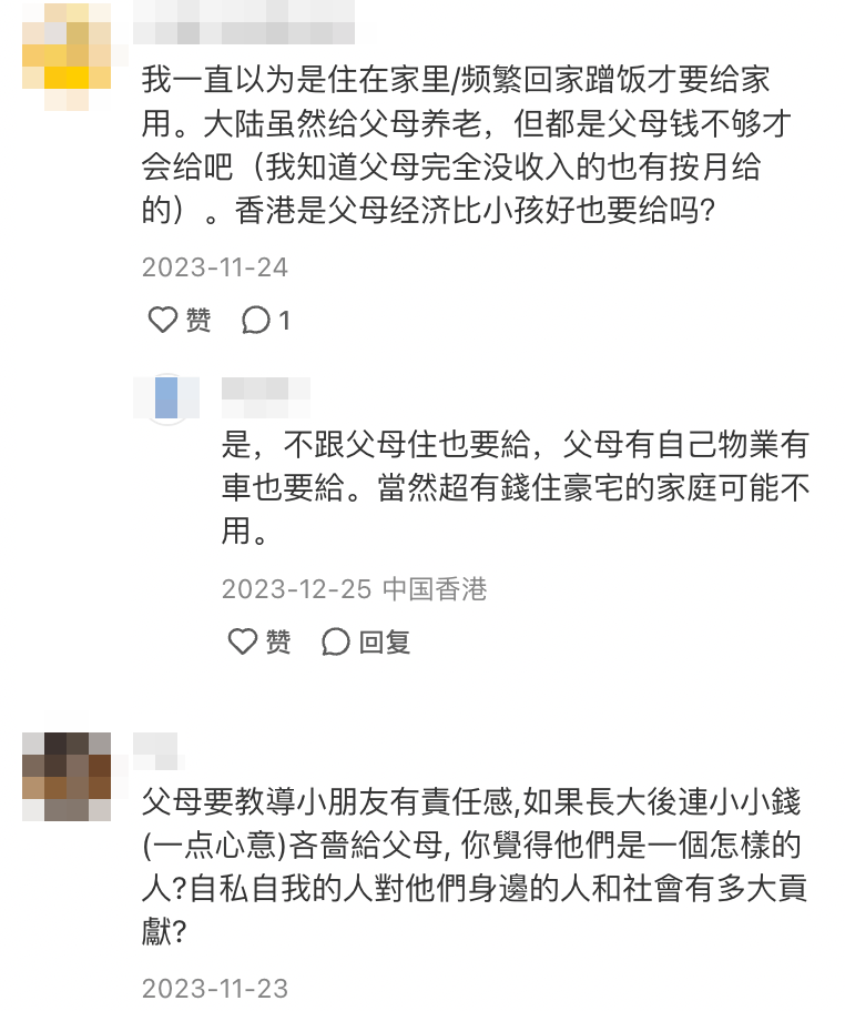 不過另外就有網友肯定家用文化,表示:「就算父母有退休金有收入,子女畀家用係作為對親恩的回饋」、「在家吃住就要給家用啊,這不是很合理麼?不然白吃白住?」、「父母要教導小朋友有責任感,如果長大後連小小錢(一點心意)吝嗇給父母,你覺得他們是一個怎樣的人?」、「住不住家裡也會給的!大陸的不是老說要給父母養老嗎?怎麼就不用給了?」、「我認為,孩子工作了應該給家用」