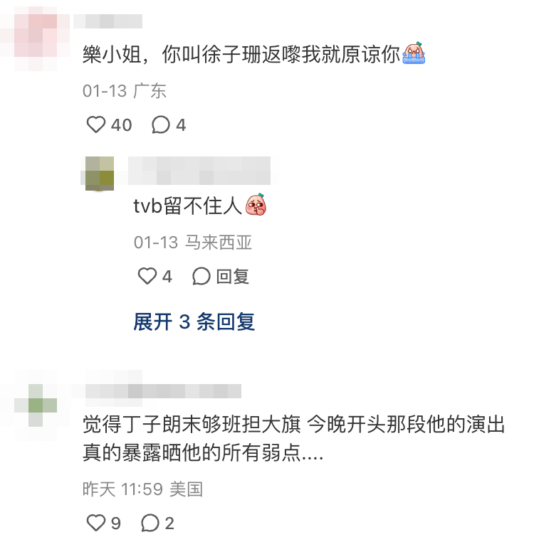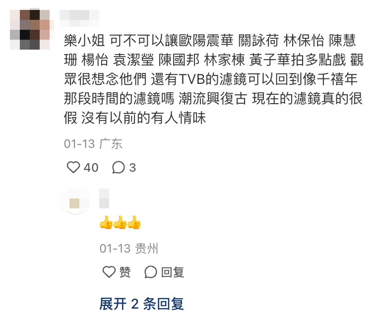 同時留言中亦有人提起了近期TVB力棒小生丁子郎的名字,並向樂小姐懇求:「求求你别再推丁子朗出來了,讓他做主持得啦!」、「還有不要丁子朗!好油好油真的受不了」此外亦有不少網友提出懷念早年的TVB演員,希望樂小姐能找他們回巢拍劇:「樂小姐希望TVB能找林保怡和陳慧珊回去拍一部電視劇」、「樂小姐,你叫徐子珊返嚟我就原谅你」、「樂小姐可不可以讓歐陽震華、關詠荷、林保怡、陳慧珊、楊怡、袁潔瑩、陳國邦、林家棟、黃子華拍多點戲?觀眾很想念他們!」