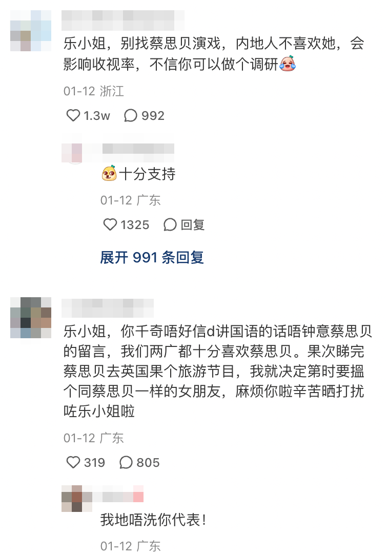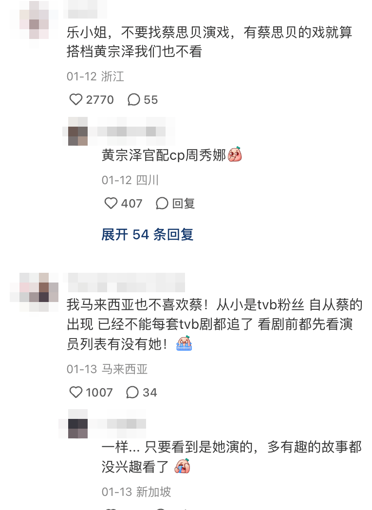 當中就有人談論有關自己不喜歡的TVB藝人,其中就以視后蔡思貝的名字被提及最多,不少網友都向樂小姐投訴指:「樂小姐,别找蔡思貝演戲,内地人不喜歡她,會影響收視率,不信你可以做個調研」、「樂小姐,不要找蔡思貝演戲,有蔡思貝的戲就算搭檔黄宗澤我們也不看」、「求求不要放蔡思貝出来折磨觀眾了」、「我馬來西亞也不喜歡蔡!從小是TVB粉絲,自從蔡的出現 已經不能每套TVB劇都追了!看劇前都先看演員列表有沒有她!」不過當中都有網民提反對意見,表示因看完蔡思貝早前拍的旅遊節目後,有喜歡上她,更指想搵到個像她一樣的女朋友。
