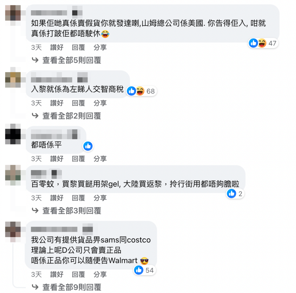然而在帖文爆光後,網友就不單沒有安慰事主,反而恥笑事主「唔識貨」,指出山姆是美國零售商沃爾瑪(Walmart)的子公司,根本就不會有販賣假貨的可能,更提到:「如果佢哋真係賣假貨你就發達喇!山姆總公司係美國,你告得佢入,咁就真係打跛腳都唔駛休」、「咪玩啦,佢賣假貨Adidas實告到佢甩褲」、「山姆賣緊嘅應該係內銷款」、「我覺得應該係水貨,唔會係A貨,咁大間外國公司唔會賣A貨啦」、「我公司有提供貨品畀Sams同Costco,理論上呢啲公司只會賣正品,唔係正品你可以隨便告Walmart」