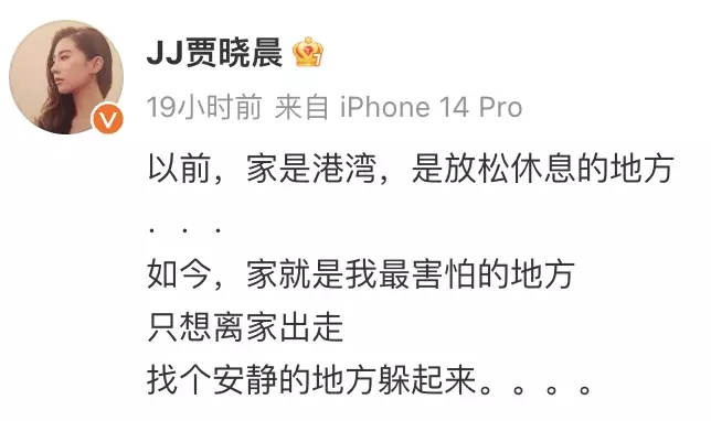 及後當天晚上JJ又再次發文,是次則感嘆說:「以前,家是港灣,是放鬆休息的地方…如今,家就是我最害怕的地方,只想離家出走,找個安静的地方躲起來…」,言詞間充滿絕望,引起不少網友留言關心。
