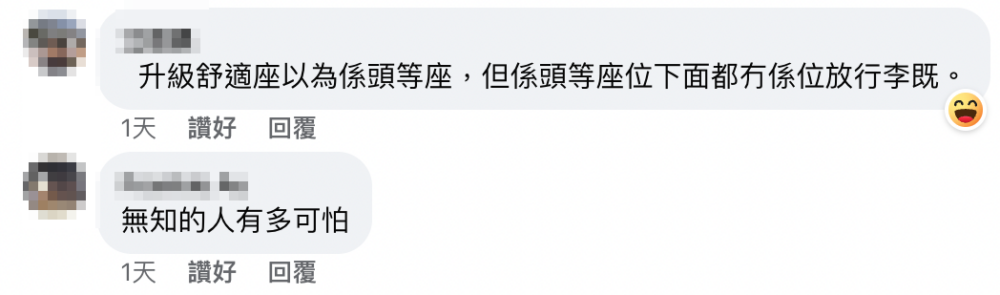 事主分享此事起初是想讓眾網友幫忙評評理,但怎料事件一出卻換來網民一面倒的負評!不少網友都認為事主是「西客」,指「終極西客,希望佢反省下」、「真係以為俾左錢可以打橫行,西客系列」,並批評到「無知的人有多可怕」、「升級舒適座以為係頭等座,但係頭等座位下面都冇係位放行李既」。同時亦有網友為空姐平反,表示「空姐做得啱喎」、「空姐有陣真係要用電話嫁,有啲PA佢地都係望住部電話讀」。