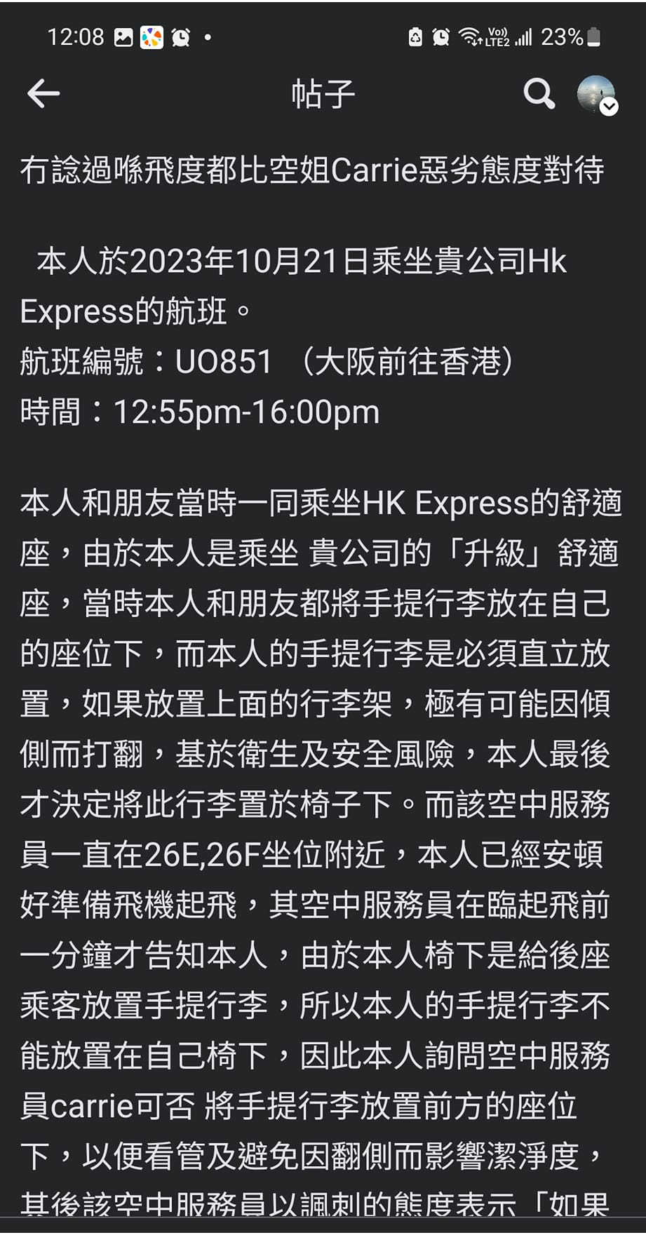 近日有名網友於Facebook「HK Express 香港快運及旅行資訊關注組(討論/分享/苦主投稿)」群組上發文,向群組成員分享自己在飛機上的不快經歷。事主提到自己於10月21日乘坐Hk Express由大阪回香港的航班,並強調與朋友乘坐的是「升級」舒適座。而由於手提行李必須直立放置,如果放置上面的行李架,極有可能因傾側而打翻,因此「基於衛生及安全風險」決定將行李置於自己的座位下。