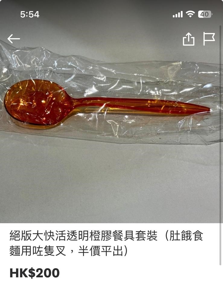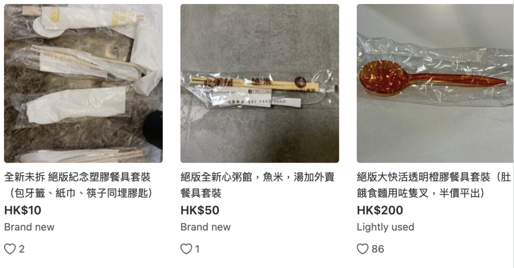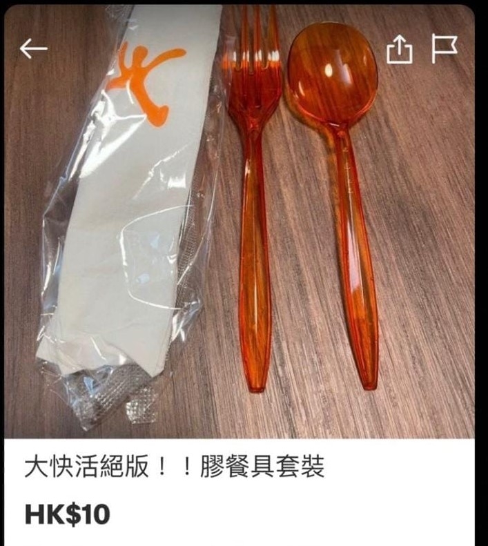 昨日(22日)作為走塑措施推行首日,一眾市民對於餐廳改用非塑膠即棄餐具的話題都議論紛紛。然而昨日就有網友發現本地二手拍賣平台竟有用戶放售連鎖快餐店膠餐具,指商品為「絕版」餐具,標價由$10起至$200不等!