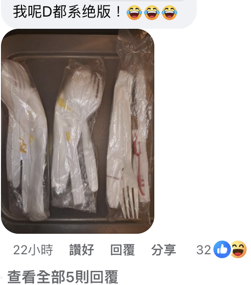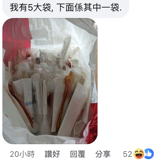 更有有不少網友貼出自己寓所或公司的外賣餐具存貨,指「有收藏價值,早知我都拎多D(啲)」、「我仲有其他快餐店絕版的膠餐具,等2年後所有膠餐具絕跡,炒到$100一套才放。」、「似乎係靠呢鋪翻身」、「我屋企有好多喎」、「我有好多欵絶版喎!」