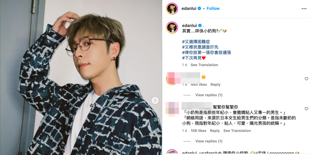 Edan昨日(24日)在IG上載8張照片,當中嘟嘴、燦笑、輕撥頭髮甫士樣樣齊,簡直Chok爆!他同時更配文寫道:「其實……咩係小奶狗? #又選擇困難症 #又嚟民意調查吓先 #俾你放第一張你會放邊張#下次再見」