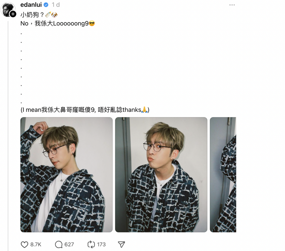 而不知是否有見討論聲音越演越烈,後來Edan就有在Threads上載同一輯照片,並解釋:「小奶狗?No,Loooooong9……(I mean我係大鼻哥窿嘅傻9,唔好亂諗thanks)」雖然Edan這次已經解釋更叫大家不要亂諗,但對於Edan的行為一眾雀屎就被嚇得一額汗,憂心道:「你公司好擔心你亂講嘢」、「ED偶像,喺thread都唔好玩命,抽著火水有排煩㗎,我唔想你俾人話啲乜嘢」。而同時亦引來某些網友諷刺他指:「你跳舞有人哋一半咁好就好啦」、「影射踩低人哋,人格都輸埋」、「自製新聞博出位,然後扮乖」。