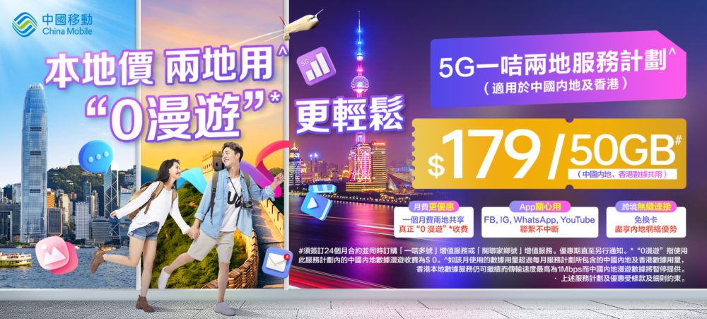 中國移動香港(CMHK)全新推出的「5G一咭兩地服務計劃」,小編認為最適合經常北上旅行消費的港人使用。一個計劃提供三個月費選擇,分別$179/50GB、$299/100GB及$399/200GB,可享中國內地及香港共用數據,達到真正‘‘0漫遊”收費,過關時毋須換卡,上網時亦毋須「慳住用」!服務計劃可讓大家隨時隨地無間斷用WhatsApp,立即打卡分享到Facebook和IG,又可坐車時瀏覽YouTube等,從此一張SIM卡遊走中國內地及香港。
