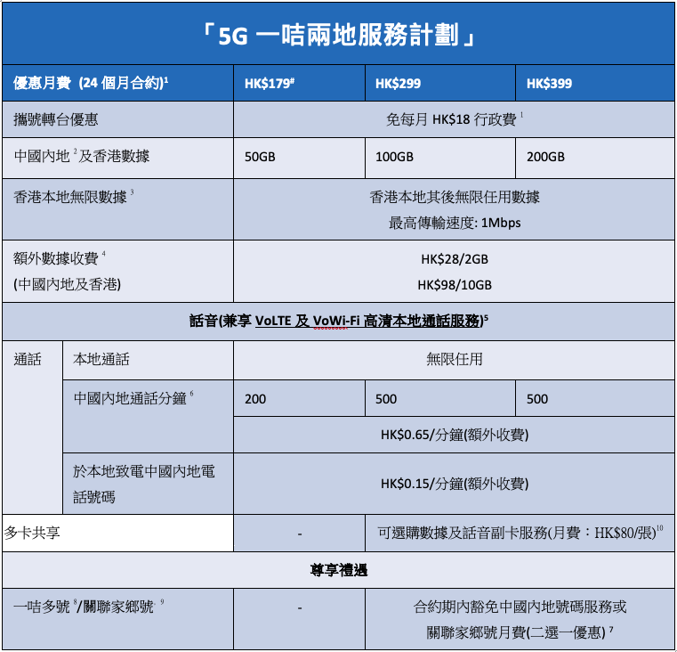 1.優惠月費價格只適用於選用上述指定服務計劃並承諾最少使用服務期24個月之客戶(另須繳付每月HK$18港鐵、隧道、流動電話服務牌照及行政費),攜號轉台並承諾最少使用服務期24個月之新客戶可於合約期內豁免每月HK$18行政費。攜號轉台客戶須於簽約後180日內成功攜號轉台。指定服務計劃的基本服務月費分別為50GB:HK$389;100GB:HK$499;200GB:HK$599。