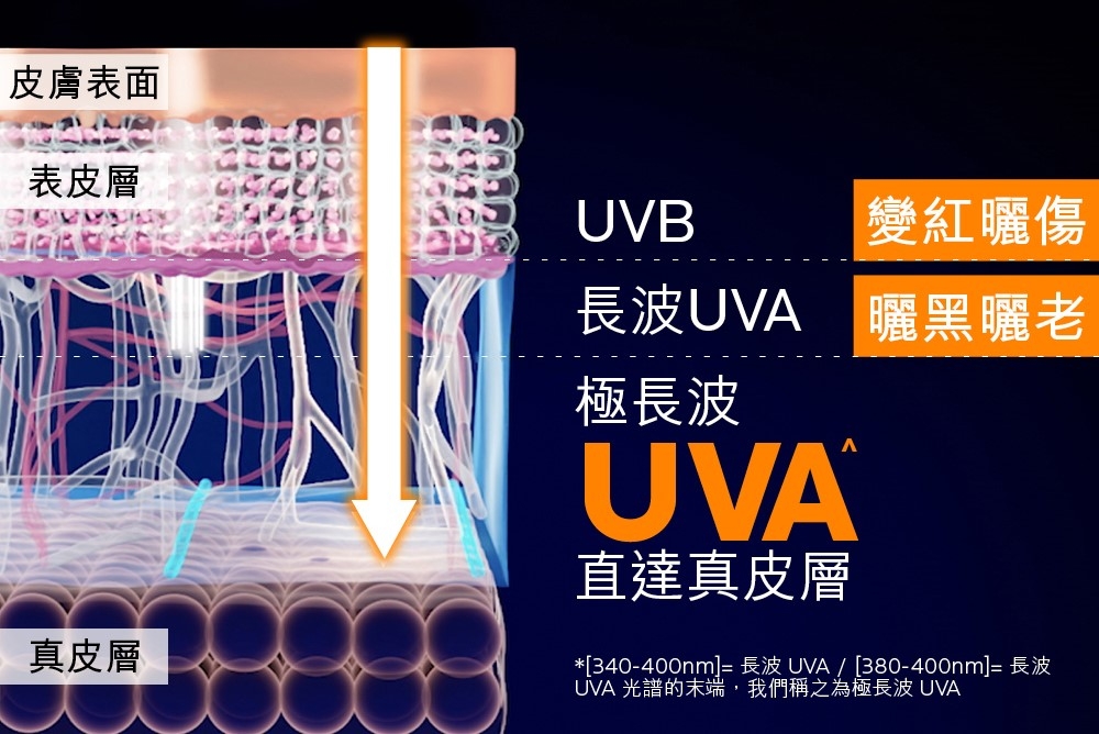 紫外線可分UVB及UBA,其中UVA可再細分為短波、長波和極長波,當中極長波UVA可以直達真皮層,對皮膚造成「光老化」傷害,出現皮膚鬆弛、黑色素沉澱、產生雀斑、傷口難癒合、催生皺紋等。想全面抵禦紫外線,便需要每天做好防曬。值得留意的是,並非所有防曬產品都可阻擋極長波UVA,因此,大家需要特別選用合適產品,加強保護。