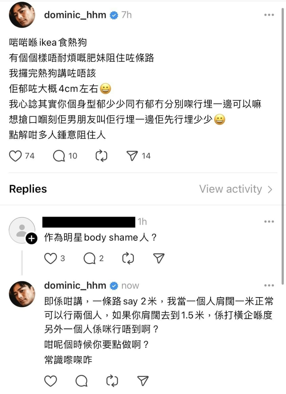 其貼文一出馬上引起網民關注,有人分享自己同樣被「肥妹」阻路的經歷,但亦有人批評Dominic行為是在網暴及公審對方,斥責指:「作為明星body shame(即羞辱他人的體型))人?」。然而Dominic本人就不同意自己是Body shame,並回覆:「同body shame冇關係,係面積。即係咁講,一條路say 2米,我當一個人肩闊一米正常可以行兩個人,如果你肩闊去到1.5米,係打橫企喺度另外一個人係咪行唔到啊?咁呢個時候你要點做啊?常識嚟㗎咋」。