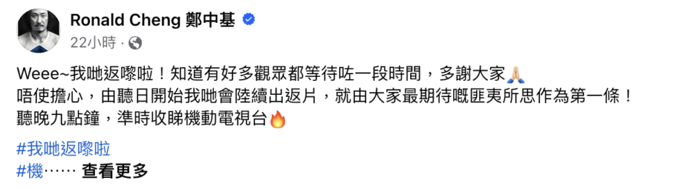 直至昨日(11日)鄭中基竟透過社交平台突然宣布將於今晚(12日)復出:「Weee~我哋返嚟啦!知道有好多觀眾都等待咗一段時間,多謝大家 。唔使擔心,由聽日開始我哋會陸續出返片,就由大家最期待嘅匪夷所思作為第一條!聽晚九點鐘,準時收睇機動電視台。 #我哋返嚟啦 #機動電視台 #鄭中基 #匪夷所思 #一人一個醫院之匪夷所思」