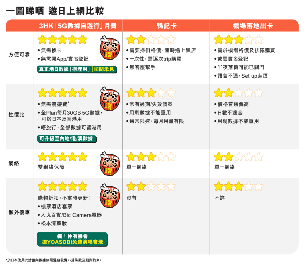 根據過往去日本經驗,日日開地圖搵路、睇搭車、搵嘢食,好易Chur晒每日上限嘅數據,直跌龜速,連睇個IG story都有困難。3台嘅港日Plan就爽手得多,每月30GB數據,喺香港同日本完全自由用,淨係呢樣都十分吸引!
