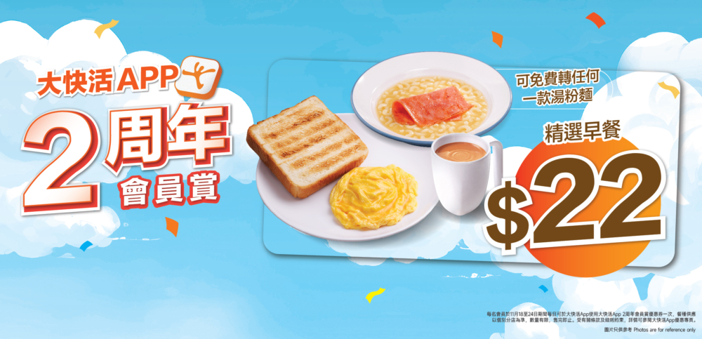 每位會員每日可獲得「$22早餐電子優惠券」,可以在早市時段以65折享用原價$34的「精選早餐」,餐點包括阿活香嫩炒滑蛋和雪菜肉絲湯上海幼麵,配牛油厚多士另只需額外$3即可加配1件雞胸柳。