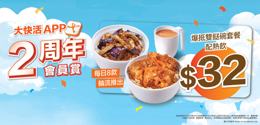 大快活APP為慶祝周年生日,推出了一系列超值優惠活動,從即日至12月15日,每週都有不同的優惠!在推廣期內,會員每天都可以在大快活APP上獲取一張「會員限定優惠券」,超抵食呀!有興趣就繼續看詳情啦!
