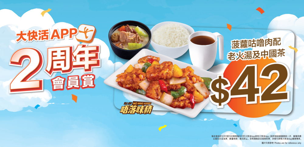 每位會員每日可獲得「$42晚市電子優惠券」,於晚市時段享用原價$56-$59的「指定唔落味精小菜連老火湯套餐」,套餐包括小菜連白飯、老火湯及中國茶,小菜選擇有滑蛋粟米魚塊、椒鹽豬柳及菠蘿咕嚕肉,額外$10可加配灼菜1份,或$8加配是日糖水作甜品。