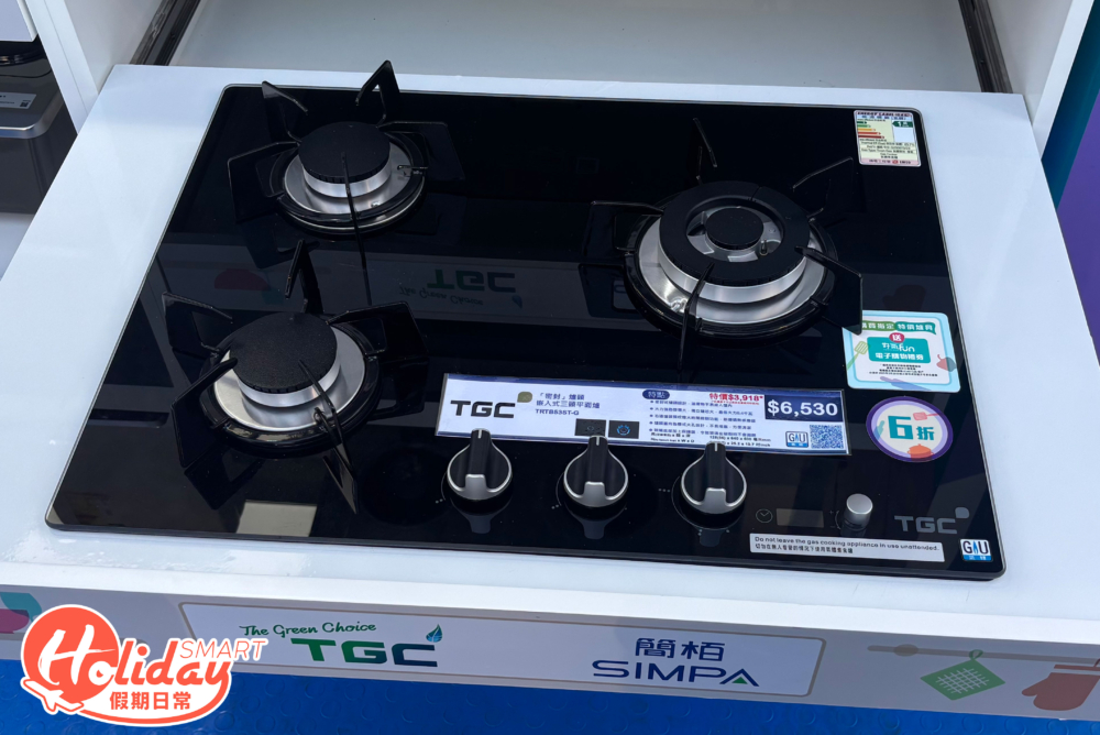火霸王煮食爐(TGC RJH2HP)聽名都知架勢,有6千瓦特大火力炒鑊爐頭,還有7折優惠($4,180>$2,926),必買!「密封」爐頭嵌入式三頭平面爐(TGC TRTB53ST-G )有超抵6折優惠($6,530>$3,918),其密封式爐頭設計,溢瀉物不易流入爐內,超級好用!