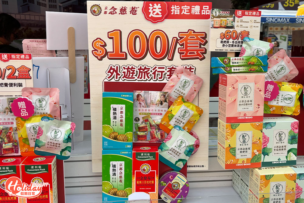 京都念慈菴(攤位編號:1B 36-39),其超人氣產品川貝枇杷膏,不少人都會放在家中備用!今次推介其他產品給大家。草本潤喉糖($60/3盒),有助紓緩喉嚨乾涸,護喉潤聲。外遊旅行套裝($100),有齊枇杷膏、積熱清等,帶同去旅游就最適合。