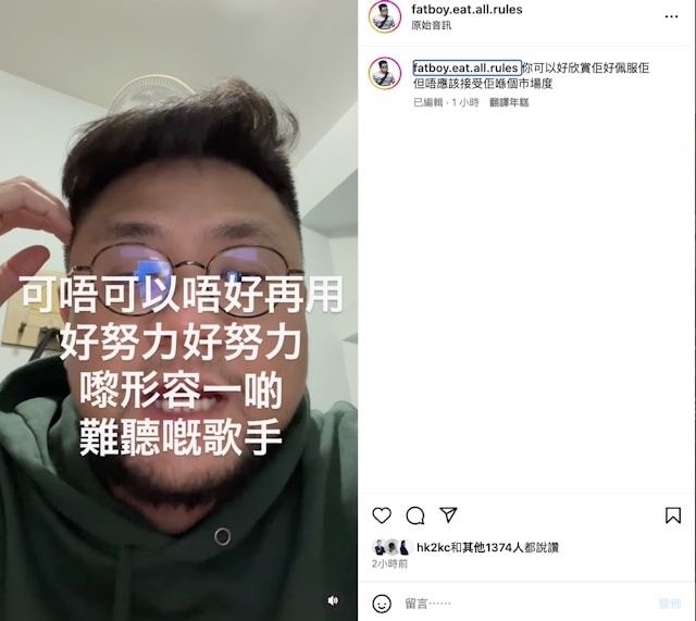 於IG擁有4.6萬Followers的網紅「嚴重脂肪哥二世」昨日(2日)鬧爆「努力論」,他拍片提到:「可唔可以唔好再用『好努力、好努力』嚟形容嗰啲難聽嘅歌手呀?如果好努力都唱得難聽嘅,咪即係你唔適合喺呢行囉!唔見你同啲醫死人嘅醫生講佢好努力嘅?我DSE 5條4、好努力,俾我做醫生啦!其他行業唔會咁㗎喎,你唔會話踢波好廢嗰啲人,『佢好努力㗎啦,俾佢繼續踢英超啦!』係唱歌呢行先係咁㗎喎,好難聽唱歌走晒音,『不過佢好努力㗎啦,畀次機會佢啦!』然後好聽嘅歌畀晒啲好難聽、走晒音嘅歌手唱囉,唱得好嗰啲冇得唱!」他更直言不諱:「你可以好欣賞佢好佩服佢 但唔應該接受佢喺個市場度」。
