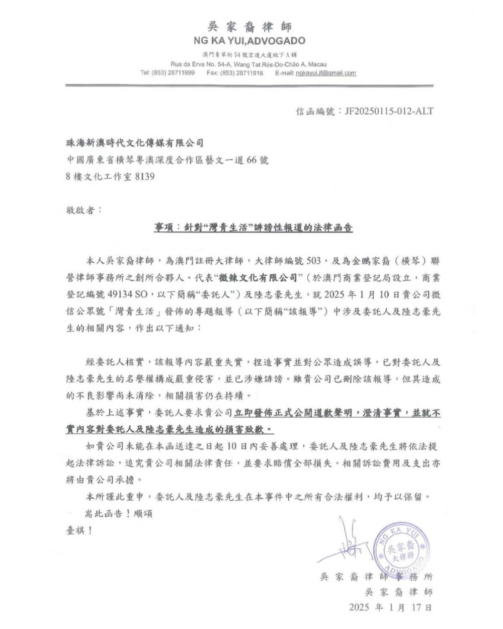 報導出街後,昨日(21日)微辣和六毫子的律師代表就以「事項:針對「灣青生活」誹謗性報道的法律函告」信件回應。帖文寫道:「我們強烈譴責這種不實信息的散播,並將不遺餘力地捍衛微辣每一位同事的名譽及人格尊嚴,也絕不會再姑息任何侵犯我們同事名譽的行為。請立即發佈正式公開道歉聲明並澄清事實,如未能妥善處理,我們將會依法追究相關法律責任。」