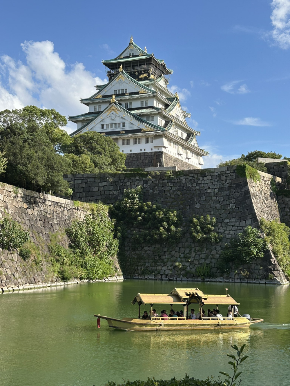 如果想用不同角度欣賞大阪城的壯麗景色,不妨搭乘大阪城御座船來場水上巡遊!這艘遊船以豐臣秀吉的「鳳凰丸」為靈感,船身鍍上金箔,華麗感十足。遊船將帶你沿著大阪城護城河航行約20分鐘,從水面欣賞壯麗的城牆與兩岸盛開的櫻花,畫面美得像明信片一樣,浪漫感爆棚!