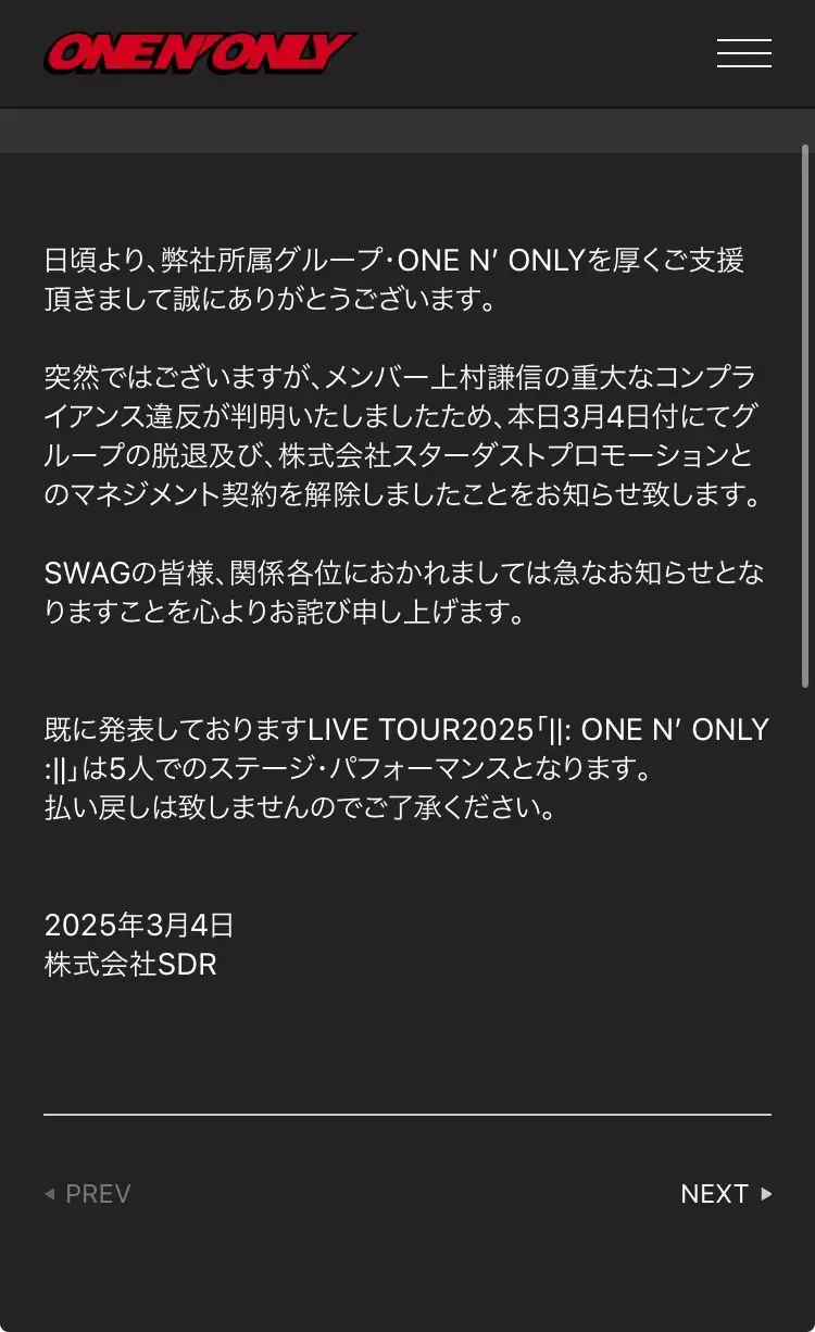 事源,現年25歲的上村謙信,於上周六(1日)與BL劇《未成年》拍檔本島純政來港舉行粉絲見面會,然而過後其所屬事務所Stardusk就在昨日(4日)突然在官方社交媒體上宣布上村謙信被解僱,以「確認嚴重違反合約行為」為由與他解約,並要求立刻退出所屬團體ONE N’ ONLY。而有粉絲亦發現ONE N’ ONLY網站及全部社交平台,亦已迅速刪去有關上村謙信的所有個人資料,其個人Instagram帳號亦被停用。
