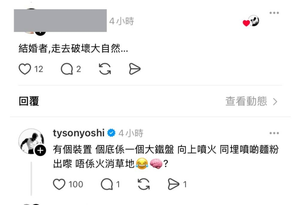 而其中就有一位網友留言指:「結婚者(啫),走去破壞大自然…」,就獲Tyson親自留言回覆,解釋當日拍攝裝置安排:「有個裝置 個底係一個大鐵盤 向上噴火 同埋噴啲麵粉出嚟 唔係火消草地😂🧠?」,不過就見Tyson文尾以笑哈哈、腦袋及問號emoji作結,就被指疑似暗指網民不用腦。