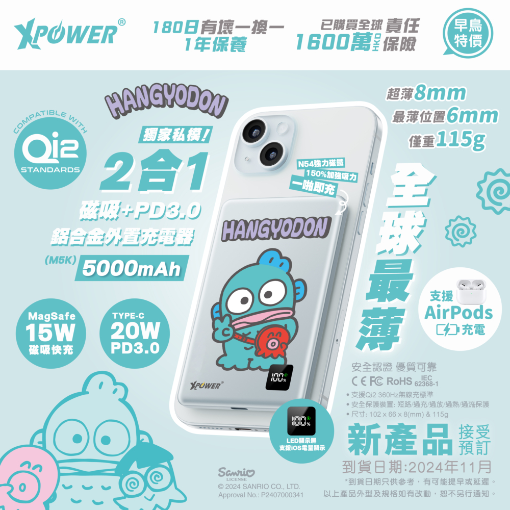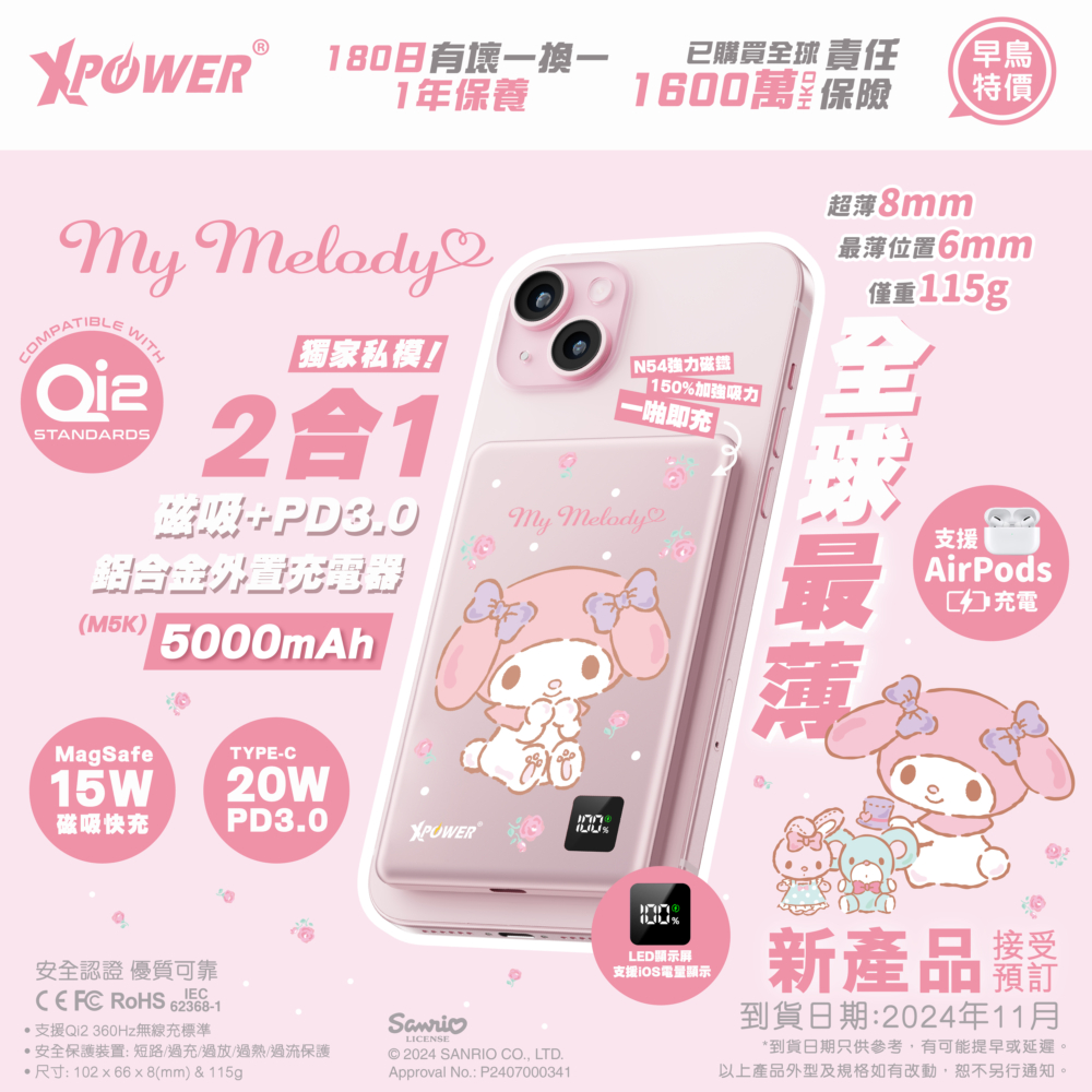 3合1磁吸 + PD3.0 設計,支援快充同磁吸無線充電(最高15W),5000mAh 容量輕巧便攜,隨時隨地幫你手機同 AirPods 補電,絕對是女生們出街打卡、旅行的必備好物!