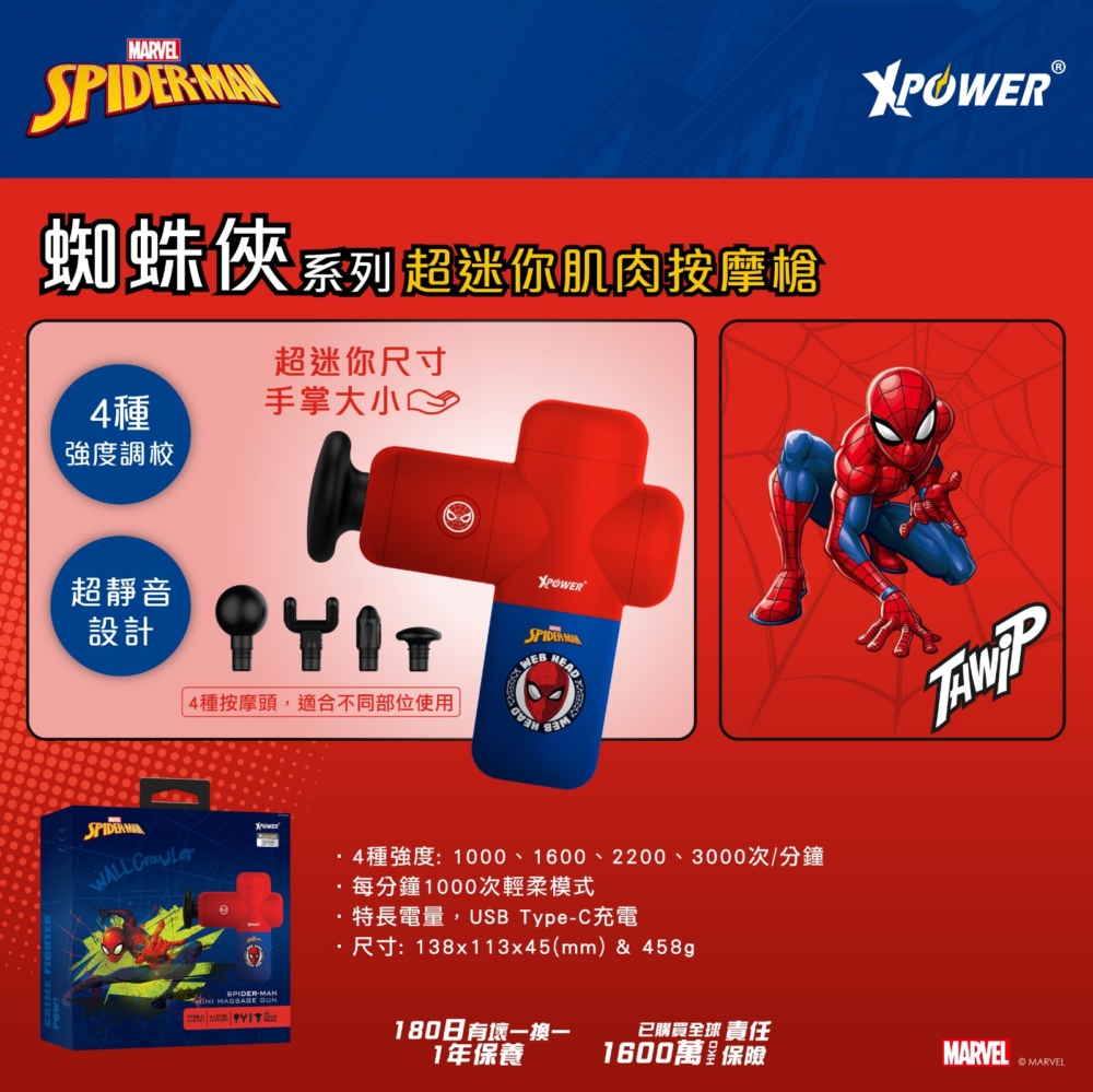 XPower全新推出鋼鐵俠MG3超迷你肌肉按摩槍,完美重現鋼鐵俠MK3型號的經典配色同標誌性頭像。雖然只有458g,但按摩效果既強勁又超靜音,最高每分鐘3000次的頻率,配合4種專業按摩頭,幫你輕鬆放鬆不同部位的緊繃肌肉!