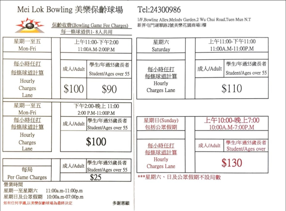 雖無最新張貼收費表,但根據最近報導,美樂保齡球場提供全港平價保齡球選擇,每局平日價格約 HK$25 起;每小時則以HK$100起。星期六則是每小時 HK$110;星期日及公眾假期則是以每小時HK$130 計算,是屯門區其中最便宜之一,特別適合家庭或學生造訪 。如需最新收費詳情,可致電球場查詢或於其官方網站/ Facebook 專頁查閱。