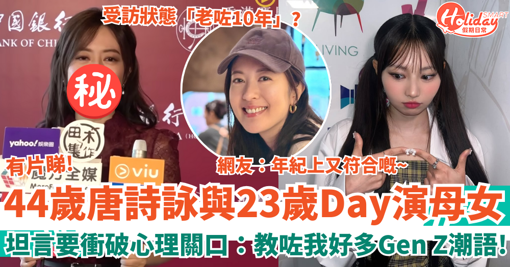 現年44歲的唐詩詠早前接拍ViuTV新劇《日落下的彩虹》,當中要與23歲許軼(阿Day)飾演母女!而近日她接受採訪時就有道出接拍原因,更有透露與阿Day有互動,對方更親切教自己Gen Z用語。只是當日訪問片段一出,網民看到唐詩詠的受訪狀態後,就紛紛留言指她「老咗10年」,更有人直言年紀差距合理?!