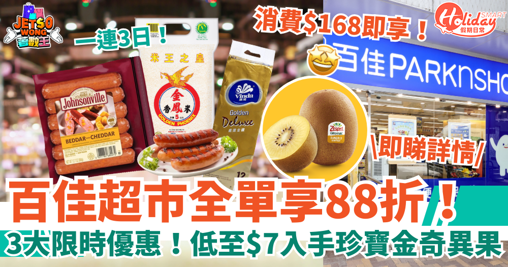 以下精選5款抵買抵食超市百貨,88折後低至$7買到珍寶金奇異果、出前一丁、金鳳牌純正泰國頂級香米(5公斤裝)、尊遜牌香腸及維達4層衞生紙等。