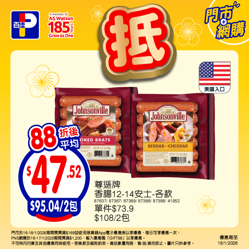 百佳超級市場推出限時入貨優惠。由 1月16日起連續三日,易賞錢會員只要於香港及澳門指定門市(涵蓋百佳、FUSION、TASTE、TASTE x FRESH、FOOD PARC 及 GREAT)單次消費滿 $168,並於易賞錢 App 出示專屬電子優惠券,即可享有全單88折優惠!