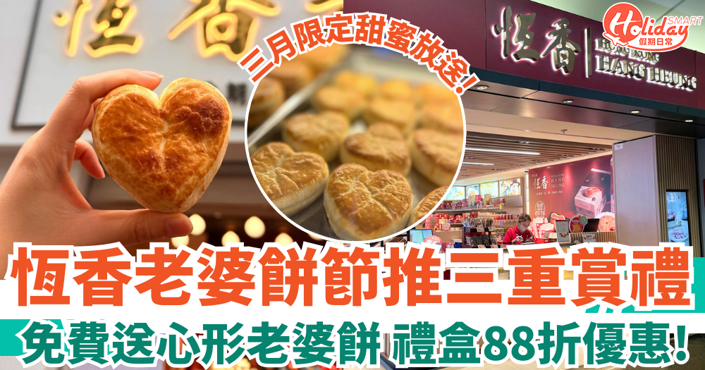 香港老字號「恆香老餅家」今年從3.8婦女節、3.14白色情人節到3.20國際幸福日,特別選定這三個別具意義的日子,首度推出「恆香老婆餅節」~期間除了會限定於3月推出三重賞禮遇,更會免費派象徵幸福與愛意嘅 「心形老婆餅」!