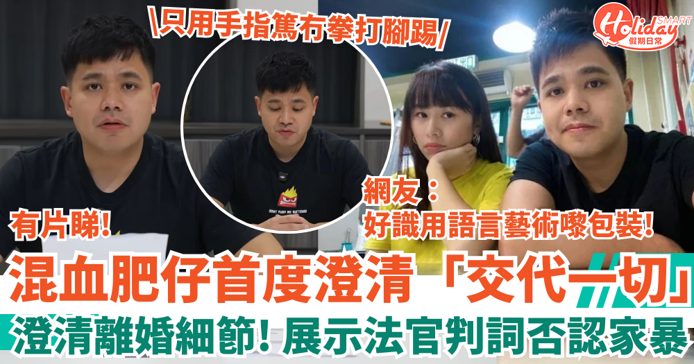 YouTuber混血肥仔去年2月與太太芊蕙子鬧離婚,男方被爆偷食公司女主持丁彥均(丁丁),日前又被網民發現他被英國法庭判罪疑似家暴罪成。事件越鬧愈大,混血肥仔昨晚就突然發布長達10分鐘的「交代一切」澄清影片,首次正面回應過去一年來關於出軌、家暴、撫養權等多項指控,惹來關注!