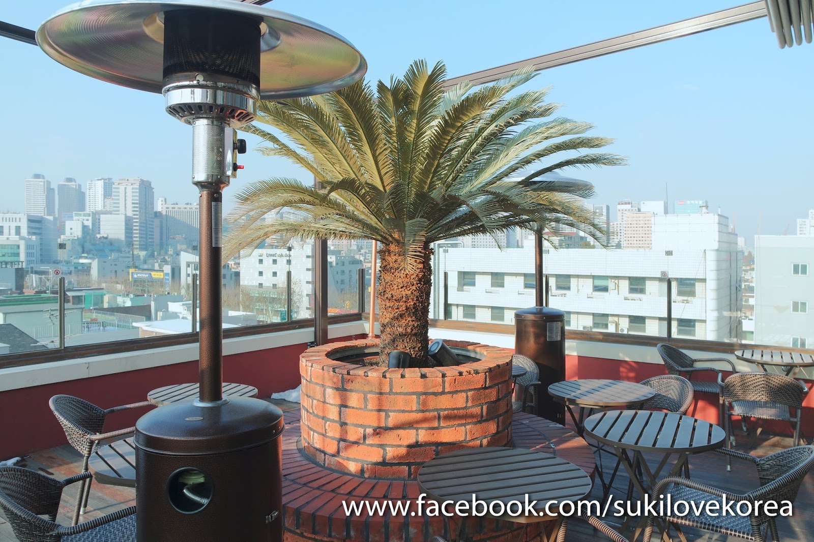小小的戶外亭園旁有一道鐵搭建的小樓梯,走過這道小梯便到達真正的美景天台拍攝區, 在一堆矮樓房中突出高高的樂天世界塔 + 大型立體『SEOUL』字型燈箱 + 免費的多變的藍天!即使你再手殘。。。都100%能拍到美景的地方!(人像拍得美,雪姬就不能保證了!)