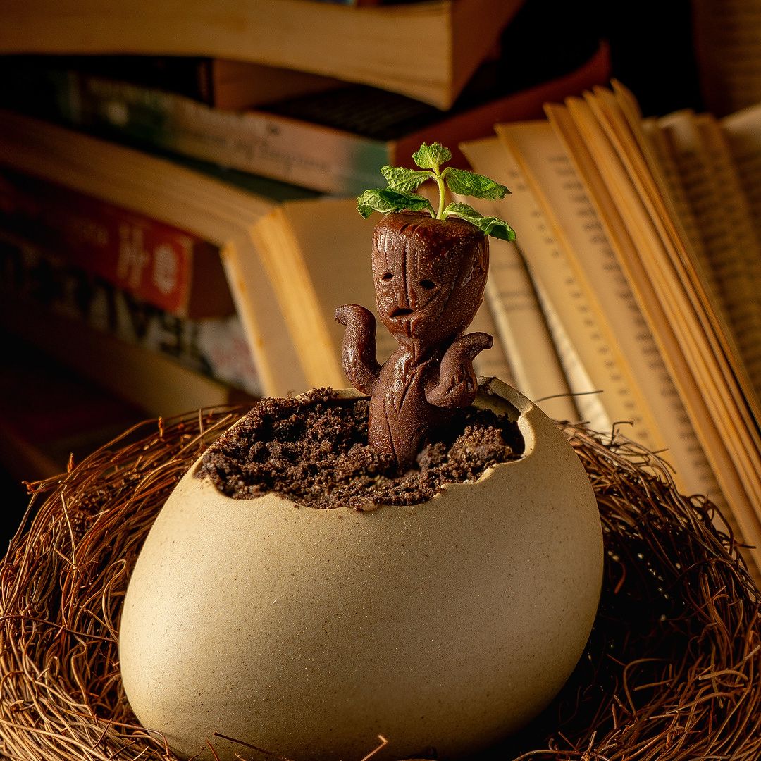 Embrace the playful with the "Baby Root"! This charming, egg-shaped pot overflows with a luscious landscape of flavors. Peek inside and discover fluffy cake layered with strawberries, bursting with juicy sweetness. A chocolate Mandrake spoon adds a touch of whimsy for a truly unique digging experience!