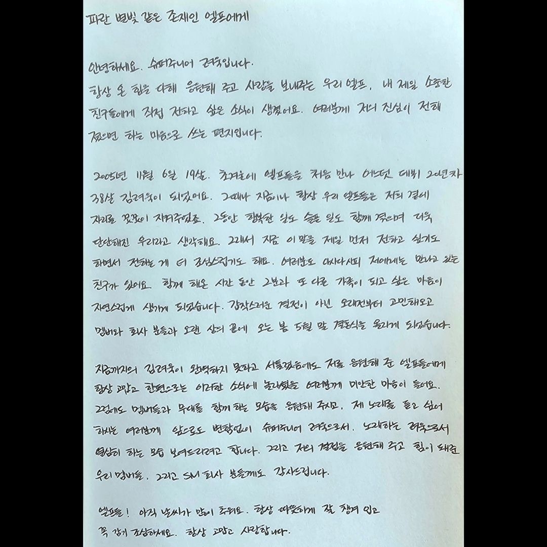 儘管如此,還是支持我和成員們一起站在舞臺上的樣子,希望聽我唱歌的各位,以後也會一如既往地作爲Super Junior厲旭,作爲唱歌的厲旭,展現努力的樣子。