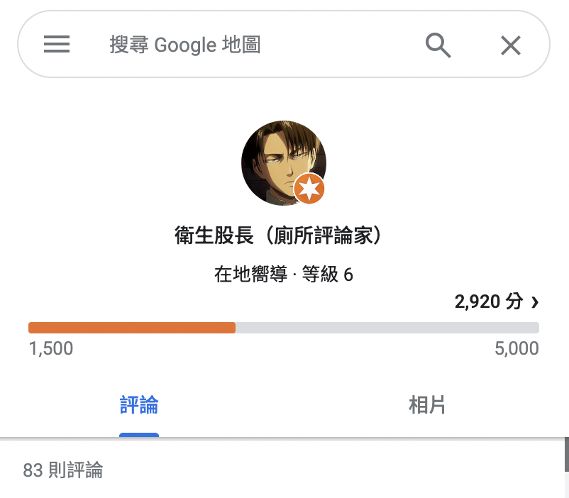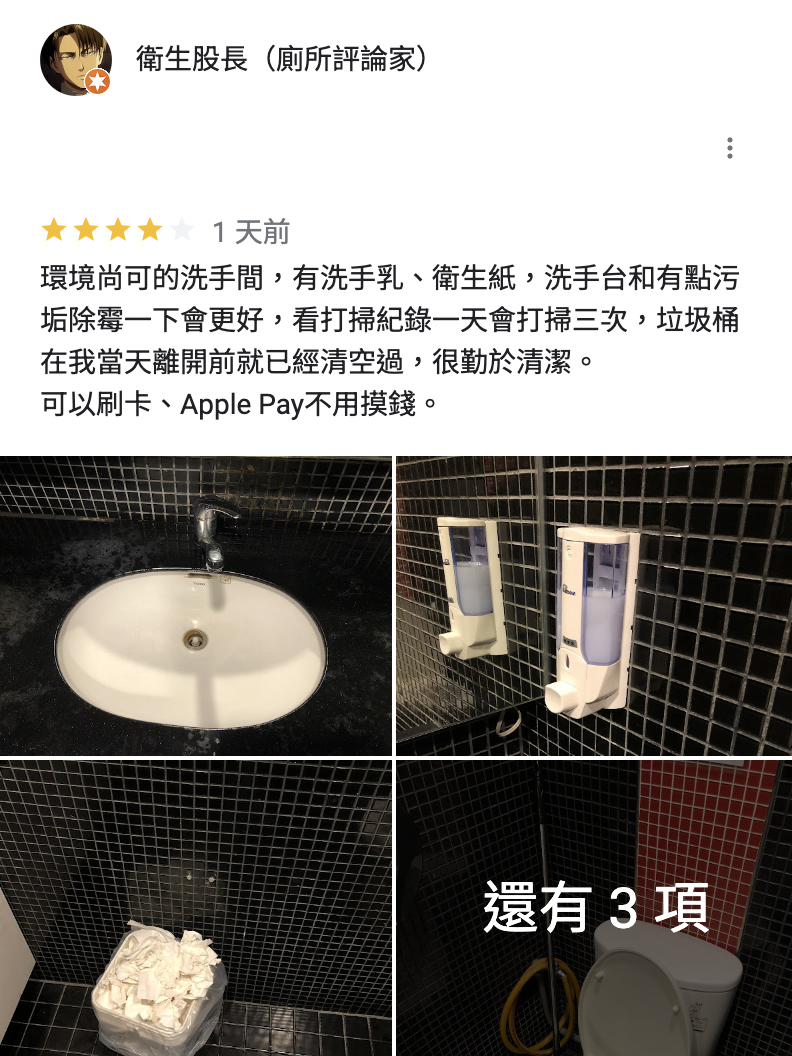 這個自稱「衛生股長」廁所評論家的帳號,以日本超火紅動漫《進擊的巨人》中的兵長「里維」設為大頭貼照片,里維的角色設定非常有潔癖、喜歡打掃,並曾聯名多個清潔產品,因此這回化身為Google評論上的衛生股長,也算是忠於本職,超級有梗!