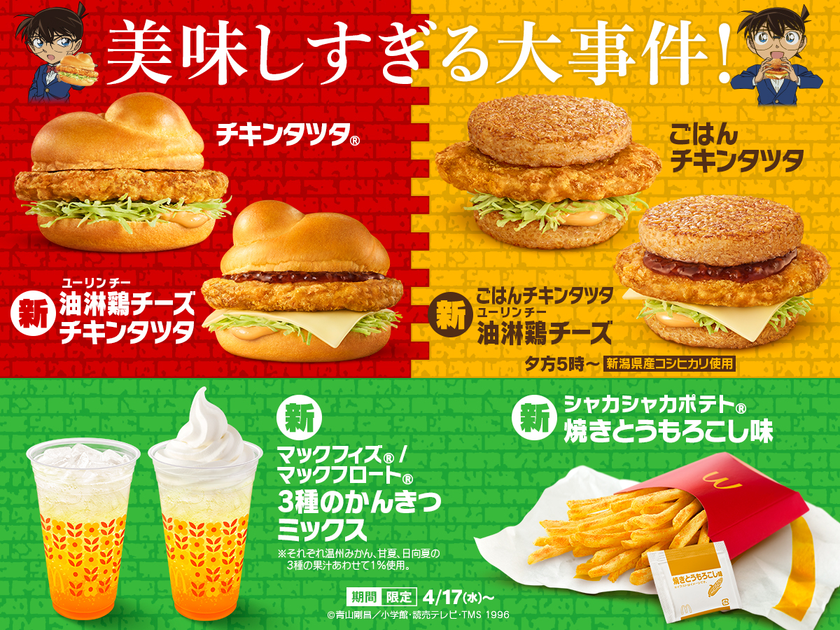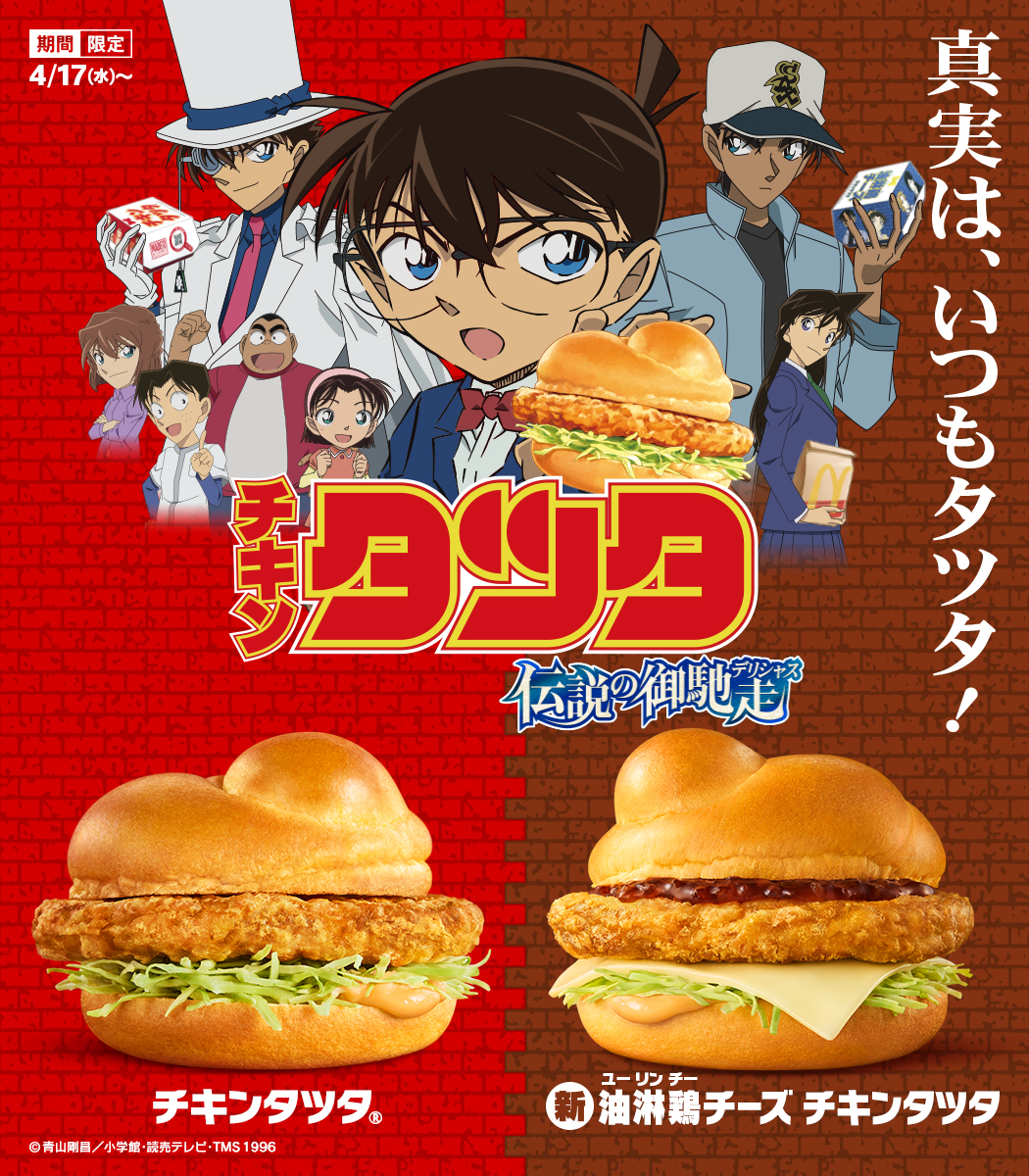 聯名以日本麥當勞1991年推出的「龍田炸雞漢堡」為主打,每次回歸開賣都超級受歡迎。與柯南聯名最具討論為《傳說的御馳走》系列,有經典原味與全新油淋雞起司口味漢堡,最大亮點在於「長角」的漢堡造型,神還原小蘭的招牌尖角頭髮!