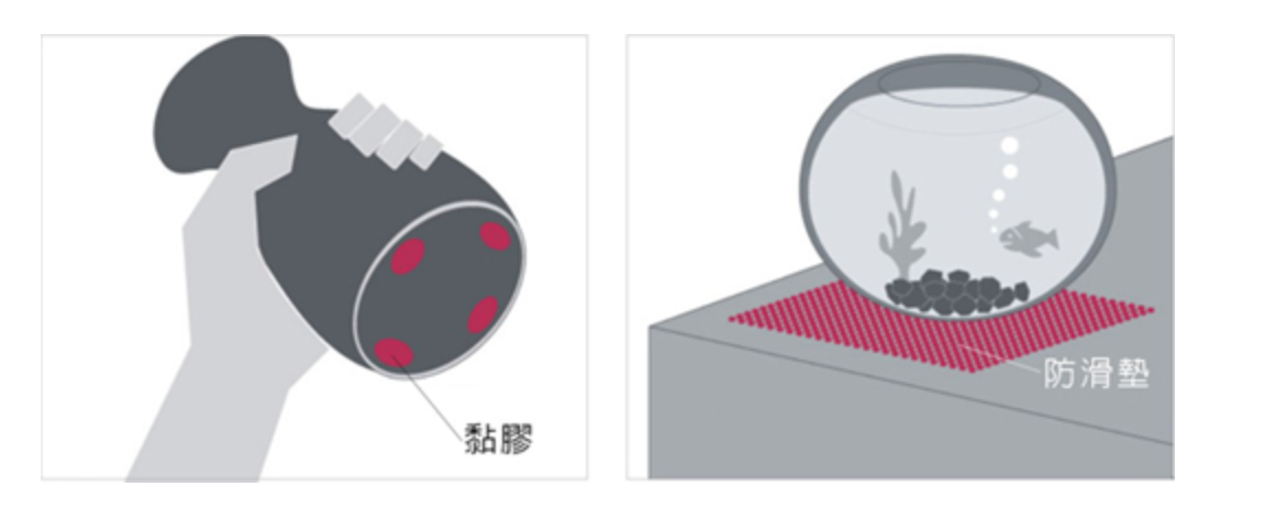 魚缸和陶瓷花瓶等易碎的小型物件,如果掉落破碎,地面將佈滿尖銳的碎裂片。為了減少這類情形發生,可以在物件底部貼上防震黏膠;而要是物件需要經常挪動,則可以放置防滑墊防止滑動。