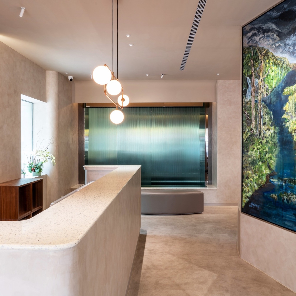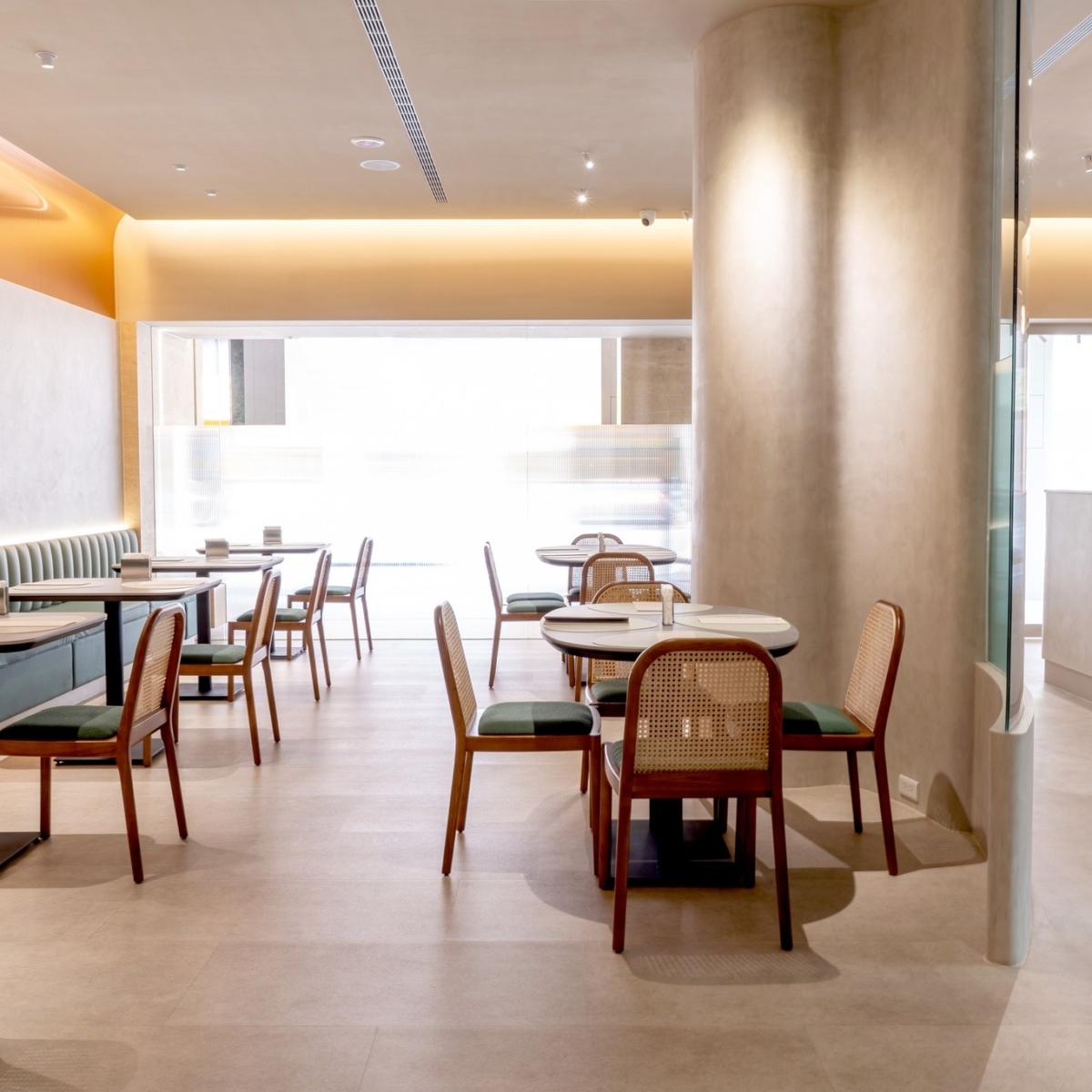 店面以品牌代表的柔和綠為主調,圓角柔和綿延的線條,象徵品嚐甜點時滑順且多層次的口感。店內裝潢則藉由長虹玻璃搭配飽和度較低的色系,營造出獨特的靜謐氛圍。值得一提的是,牆上掛有主廚Hannes家人親手繪製的巨幅畫作,更提升了整間店藝術氣息。