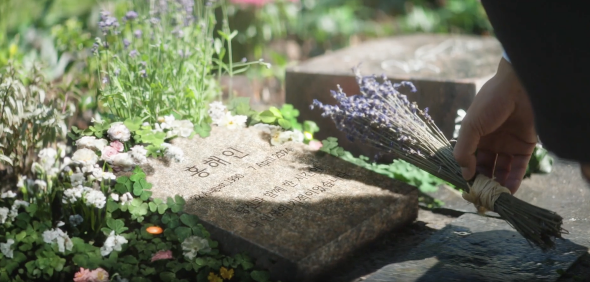在結局的最後,已屆白髮蒼蒼年紀賢祐(金秀賢 飾)帶著一束薰衣草至海仁墓前。然而這個畫面早在前面集數,2人德國蜜月時就有出現,當時海仁看到一位老人帶著花去墓園看妻子,原來就是未來的賢祐!可見編劇早預告賢祐與海仁將一起白頭偕老~