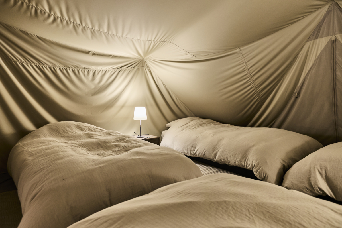 「COTTAGE-小木屋」則以享受戶外生活為特色,開放式設計可欣賞整個福岡市景!將原本的放牧場土地打造成彷彿與森林融合的客房,配備私人桑拿和水療浴缸。若想更貼近露營體驗,可選擇「TENT-帳篷」房型,特製帳篷LAND CAVE住起來相當舒適。