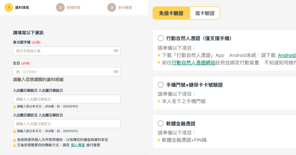首先資料填寫的部分,需輸入自己的身分證字號、生日與想要查詢的入出國日期,例如從出生日至今。接著來到身份驗證,可選擇行動自然人憑證、手機門號+健保卡卡號驗證、軟體金融憑證或是直接插卡驗證。
