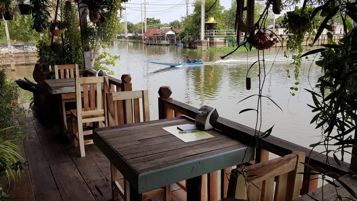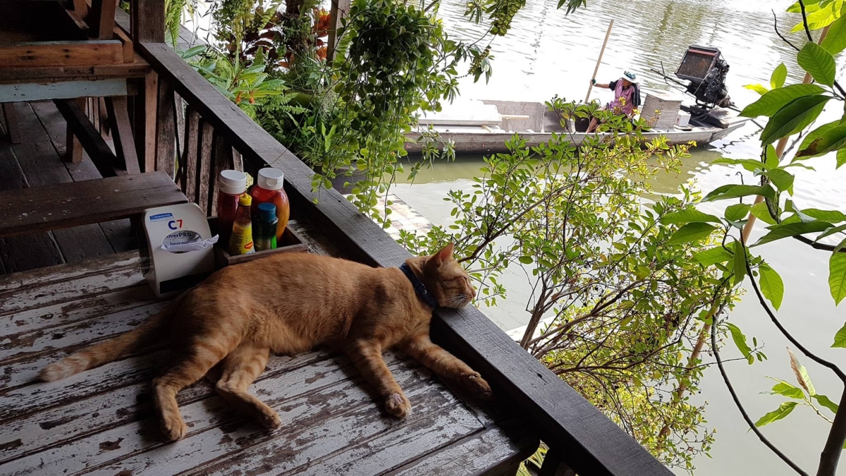 運河兩側佇立不少特色店家,這間傳統泰式雙層船屋「Si Yaek Huatakhe Cafe & Guesthouse」一樓為河濱餐廳和咖啡廳,二樓則提供住宿。由於老闆非常喜歡貓,店內飼養多隻貓咪,經常自在地走動或趴睡,來訪客人可以邊擼貓邊享受餐點,好不愜意。