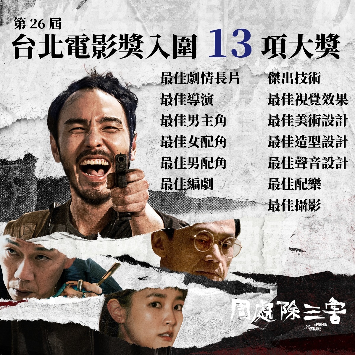 在評審團最後選出的31部作品中,阮經天主演的《周處除三害》入圍最佳劇情長片、導演、編劇、男主角、女配角、男配角等獎樣,共橫掃13項提名!讓人超期待最後會奪下幾項~另外緊追其後的作品還有《老狐狸》10項與《BIG》8項。