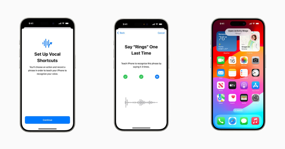 「語音捷徑」提供使用者指定Siri理解的自訂話語,以用來啟動捷徑完成複雜的操作,包含開啟App或是控制CarPlay等等。此外,其中還包括辨識「非典型語音」功能,讓後天影響言語的障礙者加強使用體驗,依據個人需求自訂和控制選項。